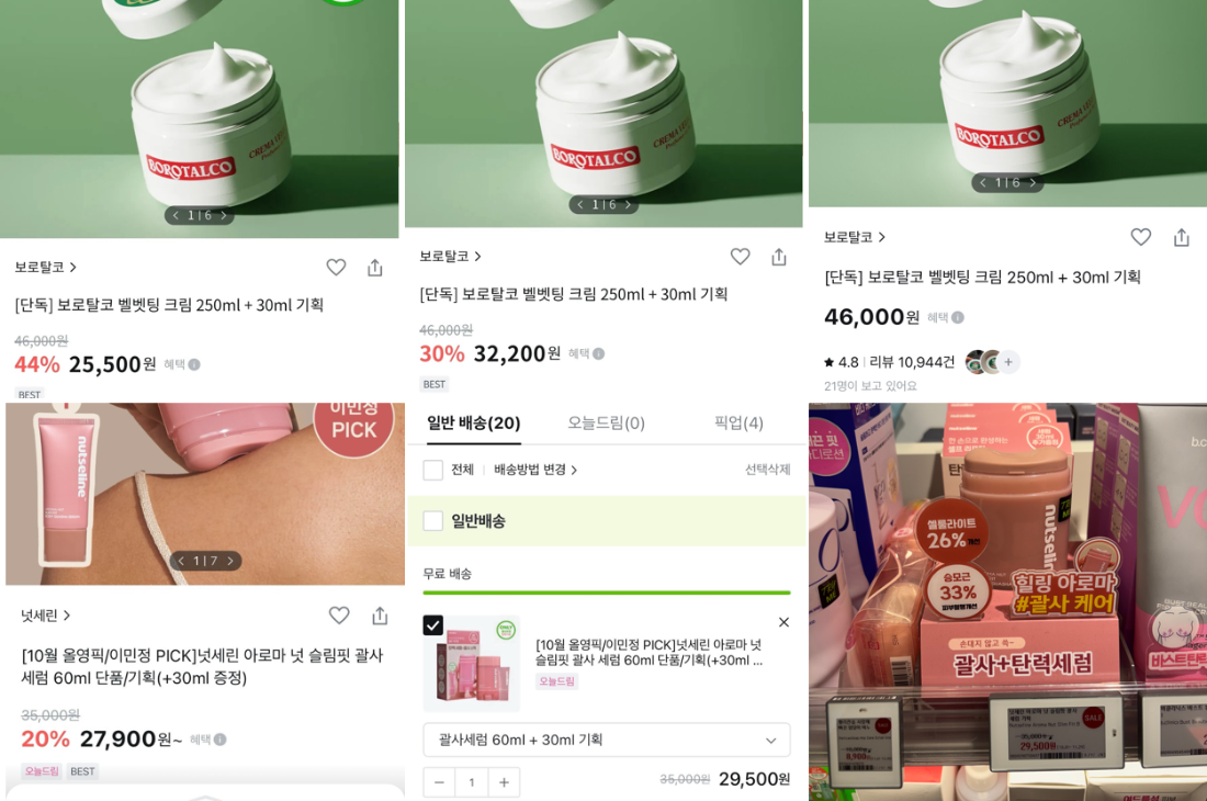 올리브영 역시 소비자 기만 논란에서 자유롭지 않다. 2025년 11월, “최대 60% 할인”을 내걸고 세일을 진행했지만, 실제로는 세일 시작 전보다 가격이 오른 채 판매된 사례가 속출했다. 가격을 먼저 올리고 쿠폰을 적용해 큰 폭의 할인처럼 보이게 한 것이다.
